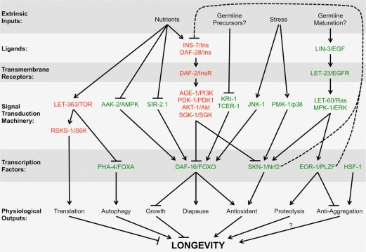 - 38. Lin K, Hsin H, Libina N, Kenyon C. Regulation of the Caenorhabditis elegans longevity protein DAF-16 by insulin/IGF-1 and germline signaling. Nature Genetics. 2001; 28: 139 -145. [PubMed] .