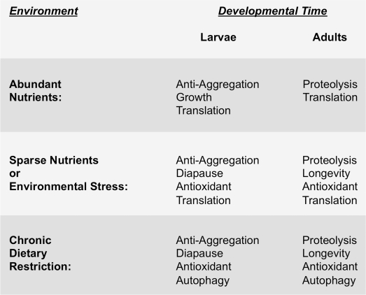 A number of important questions remain. What triggers the reactivation of LIN-3/EGF expression in adults? Is EGF signaling and UPS upregulation coupled to the maturation of the germline? Or are other developmental timing mechanisms involved? What is it about calcium release from internal stores that results in increased longevity? Is the turnover of all proteins affected by EGF signaling, or just specific subsets? What are the different F-box proteins that interact with SKR-5 as opposed to the other Skp1-like adaptors? Finally, how do the EGF and IIS pathways interact? There are common transcriptional targets between EOR-1 and DAF-16, including SKR-5 [41, 55], and EOR-1 upregulates INS-7, a ligand for DAF-2 with a known role in lifespan [80]. In addition, both IIS and EGF signaling converge on the transcription factor SKN-1, and SKN-1 in turn feeds back on IIS signaling through its regulation of INS-39 and DAF-28 [50]. The combined pathways, with IIS responding to nutritional status and EGF signaling responding to developmental timing, together create the physiological state most suited for surviving the environment at that stage in life (Figure 3). Future efforts towards understanding how these pathways interact will have important implications for understanding not only the aging process itself, but cancer, neurodegenerative disorders, and other diseases that are associated with aging.