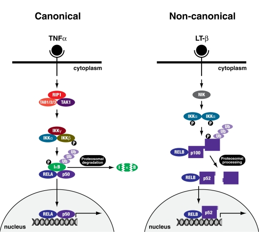 The non-canonical pathway (Figure 1) depends on the processing of the p100 precursor protein to produce mature p52 (NF-κB2) protein. This involves the NF-κB inducing kinase (NIK) phosphorylating and activating IKKα, which in turn phosphorylates p100, marking it for ubiquitination and proteasomal processing [11]. The transactivation potential of NF-κB complexes can be further potentiated by direct phosphorylation of RELA, for example, by GSK-3β, RSK1 or p38MAPK [15, 16]. How, though, is NF-κB signalling activated in senescence?
