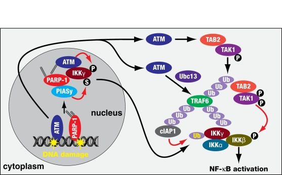 - 33. Hinz M, Stilmann M, Arslan SÇ, Khanna KK, Dittmar G, Scheidereit C. A cytoplasmic ATM-TRAF6-cIAP1 module links nuclear DNA damage signaling to ubiquitin-mediated NF-κB activation. Mol Cell. 2010; 40: 63 -74. [PubMed] .