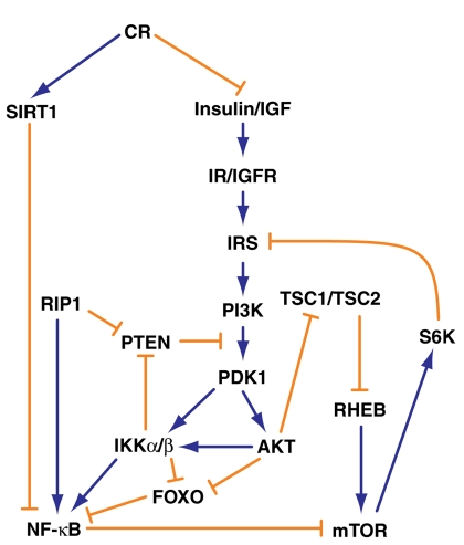 ![A schematic illustration of the pathways linking caloric restriction, Insulin/IGF, PI-3K/AKT and NF-κB signalling (adapted from Salminen and Kaarniranta [16] and Chauncey et al. [48])](https://cdn.aging-us.com/article/100390/figure/F3/large.png)