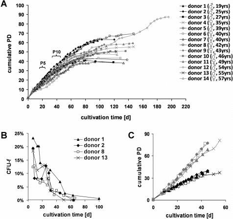 Mesenchymal stem cells from adipose tissue were expanded in culture medium with human platelet lysate (HPL) until they entered replicative senescence. Overall, the proliferation rate remained relatively high during the first two months before it declined. No age or gender-associated correlations were observed in long-term growth curves (figure 1A). All cell preparations entered growth arrest after 138 ±20 days and 53.8 ±14.4 cumulative population doublings (CPD). However, CPD do not necessarily correspond to the mean number of cell divisions as proliferation is heterogeneous in MSC: only a subset gives rise to new colonies upon passaging. To address the percentage of these highly proliferative cells we have tracked the frequency of fibroblastoid colony forming units (CFU-f) over subsequent passages. It was striking that the frequency of highly proliferative CFU-f declined continuously from about 20% in the first passage to less than 1% after two months (figure 1B). To accommodate the fact that the progeny of each passage is based on a decreasing number of highly proliferative cells, we have alternatively calculated the number of population doublings for each passage divided by the corresponding CFU-f frequency. This method of CFU-f-adjusted growth curves results in much higher numbers of cumulative population doublings (CPDCFU-f; figure 1C).