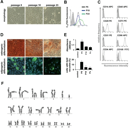 Senescent MSC displayed the typical large and flat cellular morphology. They also expressed senescence-associated (SA) beta galactosidase, which is a biomarker for cellular senescence and can be quantified with the fluorogenic substrate C12FDG. Neither morphological changes nor increase of SA-β-gal activity were observed during the exponential growth phase between passage 5 and passage 10 (figure 2A,B). The typical immunophenotypic pattern of MSC was maintained throughout culture expansion (CD14−, CD29+, CD31−, CD34+/−, CD45−, CD73+, CD90+ and CD105+; figure 2C). Another parameter for the definition of MSC is their in vitro differentiation potential [9]. Quantitative analysis of osteogenic and adipogenic differentiation revealed, that the differentiation potential decays already within early passages. Similar results have been described by many other groups before [25-28] (figure 2D,E).