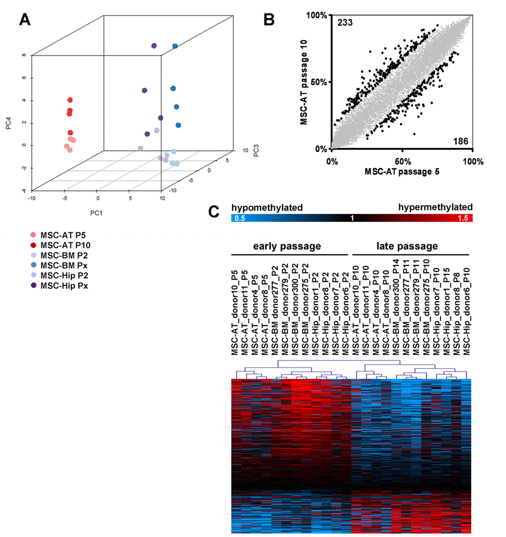 Subsequently, we analyzed if MSC acquire epigenetic modifications upon expansion. DNA methylation profiles of early passage (P5) and later passage (P10) of the four samples were compared using the Human-Methylation27 BeadChip microarray. We have previously described senescence-associated DNA- methylation changes in MSC from bone marrow which were either isolated from bone marrow aspirates (MSC-BM) or from the caput femoris upon hip fracture of elderly donors (MSC-Hip) [23]. Raw beta-values of adipose tissue and bone marrow derived datasets were quantile normalized together for subsequent analysis of epigenetic differences. Unsupervised principal component analysis (PCA) clearly separated DNA-methylation profiles according to the tissue of origin in the first dimension indicating that there are marked differences in their epigenetic make up. The second axis separated the samples predominantly according to gender (supplemental figure 1). Notably, the forth component (PC4) separated the DNA-methylation profiles of MSC in those of early and later passages (figure 3A) and this demonstrates that expansion of MSC has a very consistent impact on DNA-methylation profiles.