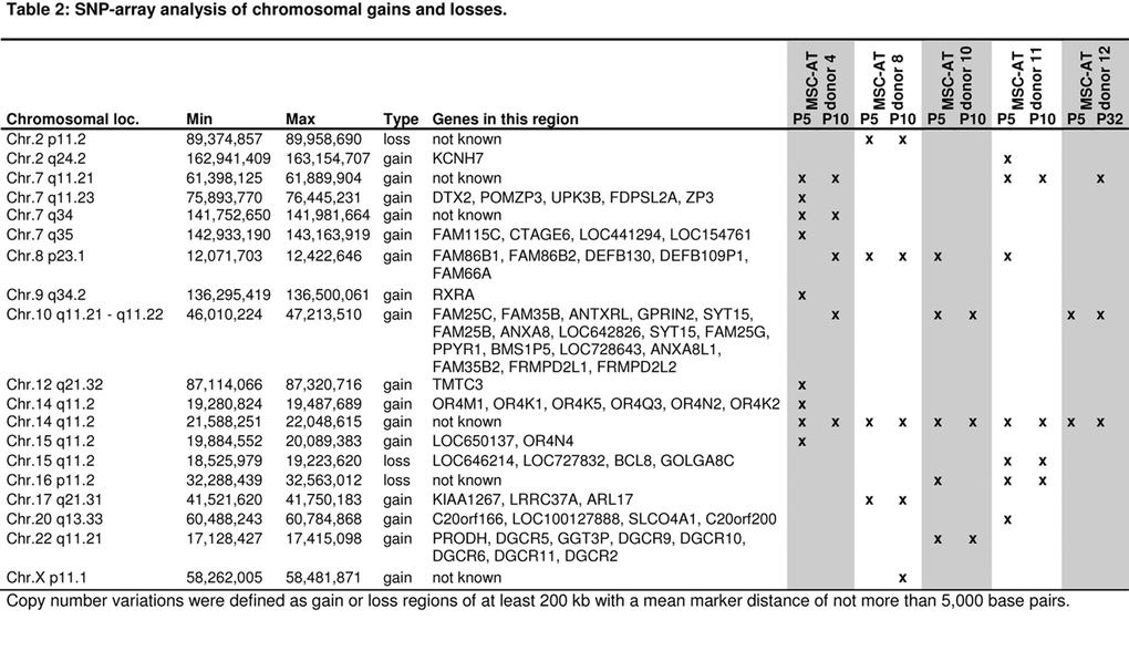 Apart from this continuous loss of proliferative subpopulations, it is of central importance if specific clones confer selective growth advantage or promote cell transformation [17]. Addition of 10% human platelet lysate results in very fast proliferation of MSC-AT and this may further trigger accumulation of genomic aberrations [18]. Our cell preparations revealed a normal karyotype although abnormalities were observed in few individual cells and SNP-arrays did hardly detect gains or losses of certain subpopulations. Since all MSC preparations reached a senescent state upon long-term culture and stopped proliferation, the detected genetic alterations did not promote cell transformation but rather confer to growth disadvantages due to DNA damage. These observations are in line with several other studies, which indicated that human MSC are relatively resistant to genomic aberrations and transformation in culture expansion [12-14,17,30]. Despite absence of major clinical side effects a potential risk remains that transplantation of MSC may harbor some tumorigenic potential - especially in autologous transplant settings. On the other hand, it is highly questionable if karyotypic analysis or SNP-arrays can safeguard this issue [17].