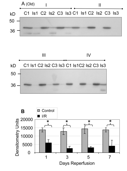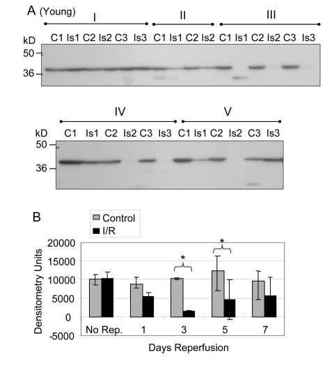 Similar analyses of the GAPDH protein levels in old muscle showed a significant decrease after reperfusion at days 1 (Group I; 61.9%, p = 0.0005), 3 (Group II; 83.1%, p = 0.014), 5 (Group III; 83.3%, p = 0.007), and 7 (Group IV; 73.8%, p = 0.013) of reperfusion (Figure 2A, 2B). The no reperfusion time point was not available for the old animals.