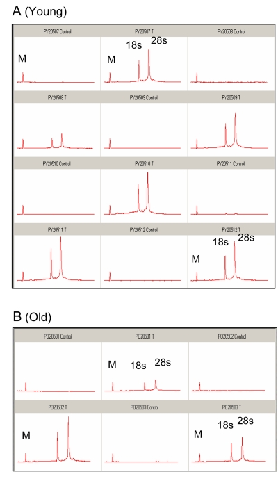 We examined the possibility that altered GAPDH transcription may play a role in the decrease in GAPDH pool levels. Total RNA from plantaris muscle was isolated from young and old mice subjected to 2 hours of ischemia and 5 days of reperfusion. An equal percentage of total RNA from each sample was analyzed using a chip-based gel electrophoresis assay to determine the quality of isolated RNA. Surprisingly, the yield of total RNA from the ischemic samples was substantially higher compared to the contralateral control, regardless of age (Figure 3A and B). The data indicate that the bulk of the increase in total RNA was from rRNA as measured by18s and 28s ribosomal subunits (Figure 3A and B).