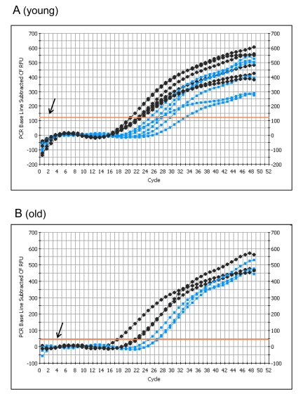 The difference between the old controls and old ischemics was also significant (p = 0.049), with an average difference of 5.4 cycles (Figure 4B). These data clearly show that there is a decrease in the GAPDH transcript levels in the I/R muscles. The difference in GAPDH transcript levels in response to I/R between the young and the old was not statistically significant. However, the data (threshold levels) suggest that the average level of GAPDH mRNA in the young muscle is approximately twice the level in the old (Figure 4).
