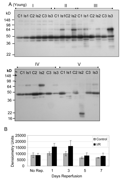 Comparing the percent increase in nitration (control to I/R) of the 37 kD band, a significant difference (p = 0.02) was noted between the young and old skeletal muscle at the 5 day time point corresponding to the peak of GAPDH nitration in the old. The level of nitration in the young had decreased by the 5th day with the peak of the increase in nitration appearing at the 3rd day of reperfusion. In summary, the greatest difference between control and I/R in the young occurs at 3 days of reperfusion, while the greatest difference in the old occurs at 5 days of reperfusion.