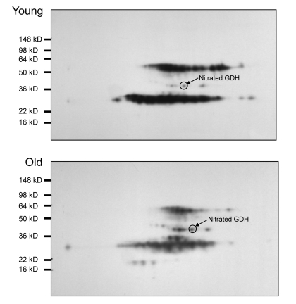Nitric oxide has been reported to increase in I/R injury although the timing and duration of the increase vary with experimental conditions [3, 13-15]. While at specific concentrations nitric oxide may be a protective factor in certain tissue stress signaling processes, excess nitric oxide can be detrimental [12, 16]. For example, interactions of nitric oxide with ROS can lead to several different types of post-translational modifications (for reviews, see [17-19]. Thus, when combined with superoxide, nitric oxide leads to the formation of damaging products [20], whether peroxynitrite [21] or one of peroxynitrite's potential end products, tyrosine nitration [22]. While some nitrosative modifications such as cysteine nitrosylation have been shown convincingly to be involved in signaling mechanisms [23-25], tyrosine nitration is usually considered to be an indication of high oxidative and nitrative stress that results in protein damage. Nitrotyrosine adducts are formed in vivo by two primary reaction pathways. These include (a) the reaction of nitric oxide with superoxide leading to peroxynitrite production and (b) the reaction of nitrite and hydrogen peroxide with various heme peroxidases. Both of these reactions lead to formation of a tyrosyl radical, followed by addition of nitrogen dioxide to yield 3-nitrotyrosine [26]. In I/R injury, both mechanisms of tyrosine nitration are likely to be elevated, due to the infiltration of immune cells, activation of iNOS, and increased ROS production [3]. To examine the role of aging and oxidative stress in muscle dysfunction following I/R injury, we used a hind limb tourniquet model to induce I/R injury in young and old mice. GAPDH protein and mRNA levels were assessed to provide insight into the effects of I/R injury on glycolytic activity. Protein tyrosine nitration was evaluated, and in addition to GAPDH, several other nitrated proteins were identified via 2D gel electrophoresis and mass spectrometry.