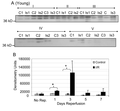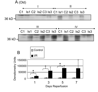 After normalization to GAPDH pool level, the nitration of the 37 kD band in the samples from old mice was significantly increased at 1, 3, and 5 days reperfusion (Figure 9; p = 0.019, 0.048, and 0.011, respectively). In contrast to the young, the highest levels of nitration measured were at the 5 and 7 day time points. However, the increase in nitration was not statistically significant at 7 days due to the variability within the I/R group (Figure 9).
