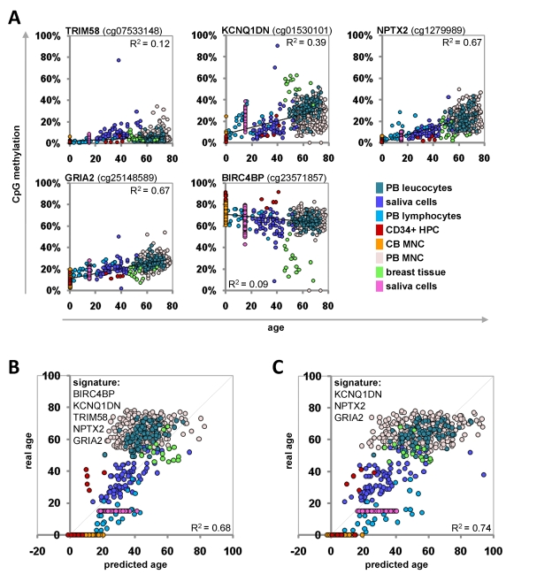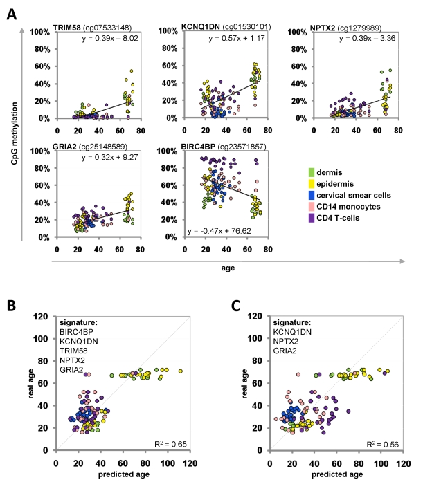 In this study we have identified an Epigenetic-Aging-Signature consisting of five CpG sites which facilitates predictions of donor age across different tissue types. This method can for example be used in forensic analysis to estimate donor age of unknown tissue specimen including blood. It has to be noted, that chronological age is not identical with biological age and it is conceivable that some of the discrepancy between predicted and real age can be attributed to this difference – further research might facilitate determination of the biological age for personalized medicine.