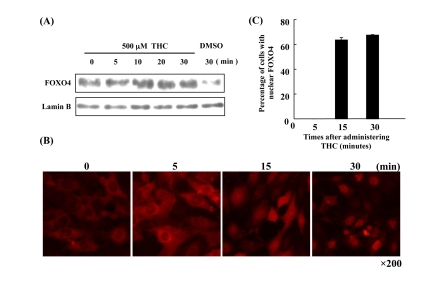 It has been shown that THC regulates the oxidative stress response in cells [22]. Nuclear accumulation of FOXO4 is a molecular marker for activation of the oxidative stress response [23]. We asked, therefore, whether THC affects the nuclear localization of FOXO4 in NIH3T3 cells. Immunocytochemistry revealed that THC treatment increased the nuclear levels of FOXO4 in a dose-dependent manner (Figure 1A). We confirmed this result through cell fractionation experiments. Levels of FOXO4 protein in the nuclear fraction were clearly elevated by THC treatment (Figure 1B). Next, we performed a time course analysis and detected FOXO4 in the nucleus within 30 min of THC treatment (Figure 2). These results indicate that THC regulates the nuclear translocation of FOXO4.