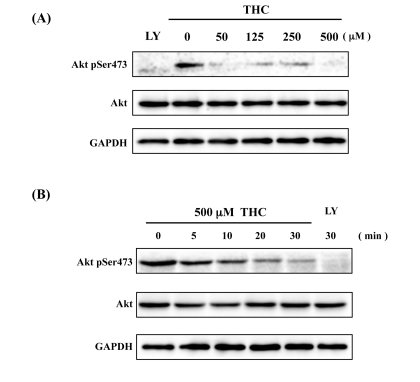 PKB/Akt kinase, acting as a downstream component of the insulin signaling pathway, phosphorylates FOXO4, and inhibits its nuclear translocation. This activity is thought to inhibit aging processes in multi-cellular organisms [25]. We focused, therefore, on the phosphorylation state of Akt using a phospho-specific Akt antibody (AktSer473). We found that THC treatment significantly inhibited phosphorylation of Akt in a dose-dependent manner. The effects of THC on phospho-Akt were similar to those observed with the positive control, LY294002 (Figure 3A). Time-course analysis indicated that THC treatment inhibited Akt phosphorylation within 30 min (Figure 3B). This result was consistent with the time-course analysis of FOXO4 nuclear localization (Figure 2). These analyses suggest that THC promotes translocation of FOXO4 to the nucleus at least in part through inhibition of Akt phosphorylation.