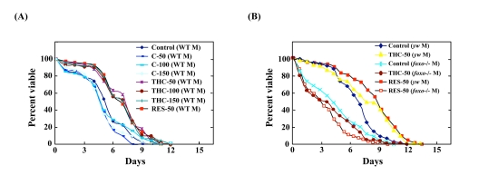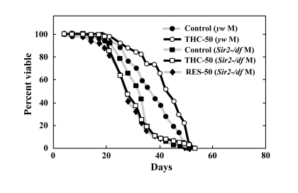 Caloric restriction is known to have an anti-oxidative effect and to extend life [42]. The life-extending effect of caloric restriction is associated with increased level and activity of Drosophila Sir2 histone deacetylase and its mammalian ortholog, SIRT1 [35, 43]. SIRT1 also seems to be involved in the oxidative stress response by regulating the nuclear localization of FOXO [27]. We demonstrated here that both RES and THC depend on foxo and Sir2 to extend the life span of Drosophila. Although we do not know whether THC and RES share a common target in order to regulate longevity, we expect that THC and RES regulate very similar down-stream effectors. THC may regulate FOXO, which might be involved in Sir2-dependent life-span extension.