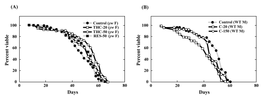Drosophila medium consisted of 0.7% agar, 10% glucose, 4.5% corn powder, and 4% dry yeast. C and THC in EtOH were added to melted aliquots of medium at final concentrations of 0, 20, 50, and 150 μM (5% EtOH). EtOH alone was used as a control. Fresh medium was prepared weekly. For survival assays, newly eclosed flies were maintained at 20 flies/vial on standard laboratory food at 25°C. Flies were transferred to fresh vials every 2-3 days and scored for survival. Each experiment was conducted with at least 200 flies of each genotype. All the analyses of life span are summarized in Table 1.