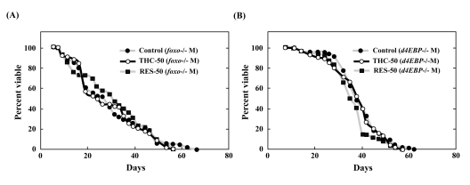 We next tested the ability of THC to extend the life span of foxo-null mutant flies. Compared to wild-type Drosophila, foxo mutants were short-lived. THC exposure, however, did not extend the life span of these foxo mutants (Figure 6A; Table 1). To confirm these results, we analyzed the effect of THC on a null mutant for the gene encoding eukaryotic initiation factor 4E-binding protein (d4E-BP), which acts downstreamof foxo to mediate aging and oxidative stress responses [31-33]. THC did not alter the life span of d4E-BP-null mutant flies (Figure 6B; Table 1). The effect of RES on life span was similarly abrogated in both foxo and d4E-BP mutant backgrounds (Figure 6; Table 1). These data indicate that THC and RES regulate the life span of Drosophila through foxo and d4E-BP activity.