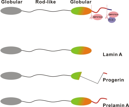 In our earlier study involving human Hutchinson Gilford progeria syndrome (HGPS) patient fibroblasts, defective DNA repair and genomic instability was demonstrated [34]. Clinical manifestations in HGPS patients include accelerated aging symptoms like hair loss and greying, atherosclerosis, short stature, sculpted nose, reduced subcutaneous fat, decreased bone density and cardiovascular diseases. HGPS patients die at an average age of 13 years due to complications related to atherosclerosis. A single de novo point mutation of nuclear protein lamin A gene at position 1824 (C to T) in exon 11, was found to be predominantly responsible for this syndrome. Lamin A is synthesized as the precursor protein, prelamin A which is modified at its carboxyl-terminal through a series of post translational modifications. The modifications include farnesylation of the cysteine in the C-terminus CAAX (C-cysteine, A-aliphatic, X-other amino acid)-motif, followed by proteolytic cleavage of the AAX-peptide, and methylation of the farnesylated cysteine. The metalloproteinase, Zmpste24, is responsible for the sequential proteolytic cleavage of prelamin A into functional and mature lamin A. The point mutation identified from HGPS patients results in the activation of an aberrant cryptic splice site causing the deletion of a 50 amino acid region from the C-terminal end of prelamin A [35]. Since the deletion harbours a cleavage site for the enzyme Zmpste24, prelamin A cannot undergo complete processing into mature lamin A in HGPS patients, and a truncated protein that lacks amino acids 607-656 (called as progerin) accumulates in cells. Thus, the unprocessed forms of lamin A, progerin and prelamin A accumulate in HGPS and Zmpste24-null cells respectively (Figure 1).