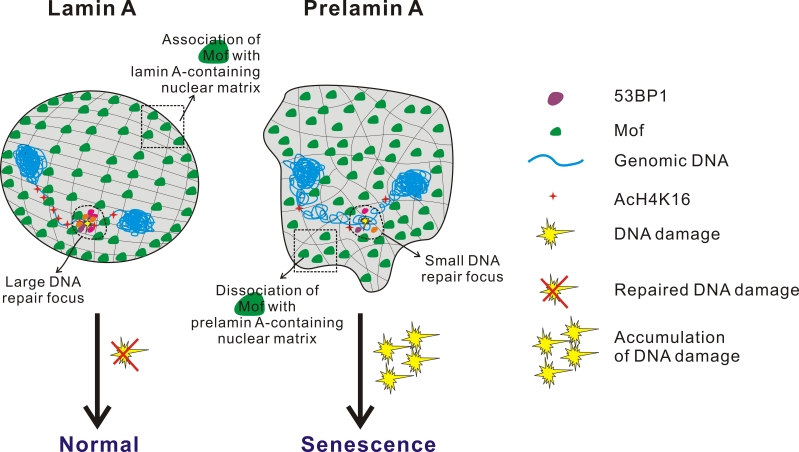 As an extension of this idea, it was rationalised that global reduction of H4K16 acetylation may result in genome-wide chromatin compaction in Zmpste24-null cells, which has to be relieved first before repair proteins such as 53BP1 gain access to DNA damage sites. This model was tested by the re-introduction of Mof, which elevated H4K16 acetylation levels and dramatically promoted the recruitment of 53BP1 to sites of DSBs in Zmpste24-null cells. Consistently, as predicted, Mof knockdown had an opposite effect in that cellular senescence and accumulation of irreparable DNA damage exacerbated even further. Thus, an inverse correlation could be drawn between Mof function, DNA repair and premature senescence (Model summarized in Figure 2).