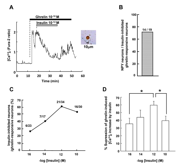 A large majority of neuropeptide Y (NPY) neurons in the hypothalamic arcuate nucleus (ARC) express the ghrelin receptor, growth hormone-secretagogue receptor (GHS-R) [13], and ghrelin directly interacts with and increases cytosolic Ca2+ concentration ([Ca2+]i) in the NPY neurons isolated from ARC [14]. It was shown that ghrelin also increases food intake via vagal afferent-mediated neural transmission to NPY neurons in ARC [15]. Thus, the principal mediator of orexigenic action of ghrelin is the ARC NPY neuron. On the other hand, anorexigenic effect of insulin could also involve the hyothalamic NPY. Inhibition of insulin receptor expression in the hypothalamus causes hyperphagia and increases fat mass [16]. Intracerebroventricular (ICV) injection of insulin inhibits the fasting-induced expression of NPY mRNA in the hypothalamus [17]. Insulin deficient type 1 diabetes exhibits increased expression of NPY and hyperphagia [18]. These reports suggest that the anorexigenic effect of insulin is mediated by inhibition of NPY neurons in the hypothalamus. However, direct effect of insulin on the ARC NPY neurons has not been evidenced. In the present study, we aimed to determine whether insulin directly interacts with ARC NPY neurons and counteracts the stimulatory action of ghrelin. We isolated single neurons from the ARC of rats aged 6 weeks when the feeding function largely matures, measured [Ca2+]i to monitor the neuronal activity, and observed direct effects of ghrelin and insulin on [Ca2+]i. Localization of the insulin receptor in NPY neurons of ARC was studied immunohistochemically.
