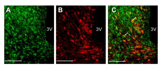 Colchicine (0.2 mg/15 μl) was ICV injected 1 day before the perfusion. Rat brains were perfused with 4 % parformaldehyde and embedded in paraffin wax. Five μm coronal sections of brain between −1.78 and −2.45 mm from bregma based on the structure of the Brain Maps [27] were cut using a microtome. To retrieve antigenicity, sections were heated by autoclave in 10 mM citrate buffer for 20 min [28]. Sections were immunostained according to standard procedures [26, 28]. Mouse monoclonal antibody against insulin receptor β-subunit (CHEMICON, CA, 1:100) and rabbit anti-NPY antibody (Diasorin, Srillwater, MN, 1:10000) were used as primary antibodies, and Alexa 488 labeled anti-mouse IgG and Alexa 594 labeled anti-rabbit IgG (Molecular probes CA, 1:500) were used as secondary antibodies, respectively. Fluorescence images were acquired with Olympus BX50 fluorescence microscope.