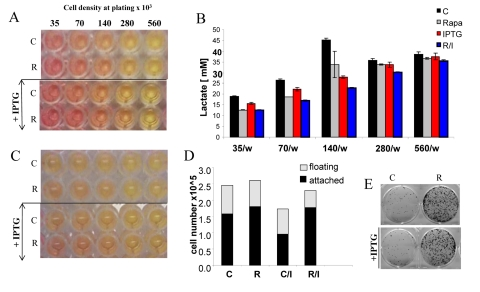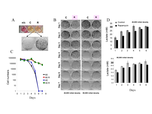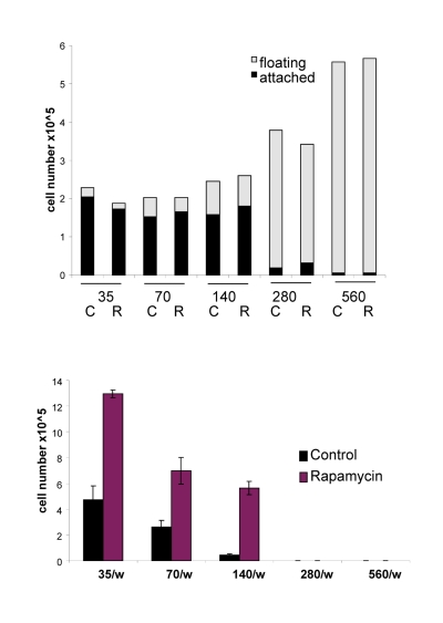 The acidity (yellow color) of the medium was proportional to initial cell numbers up to 140000 (Fig. 8 A) and corresponded to deadly levels of LA (Fig. 8 B). Rapamycin decreased levels of lactate. Noteworthy, highest levels of lactate were achieved at initial density 140000 (Fig. 8 B), but not at higher densities. At initial density of 280000 and 560000, all cells died within several days (Fig. 9, upper panel). These cells were floating and did not produce any colonies (Fig. 9, lower panel). On day 4, numbers of adherent (alive) cells were approximately identical at initial plating densities between 35000 and 140000 (Fig. 9, upper panel). This means that cells underwent 2, 1, and 0 divisions when plated at initial densities of 35000, 70000 and 140000, respectively. Most importantly, rapamycin did not affect the number of live cells (Fig. 9, upper panel); even though it decreased LA levels (Fig. 8 B). Despite rapamycin did not have an effect on the number of live cells, it dramatically increased the number of cells with replicative potential (Fig. 9, lower panel).