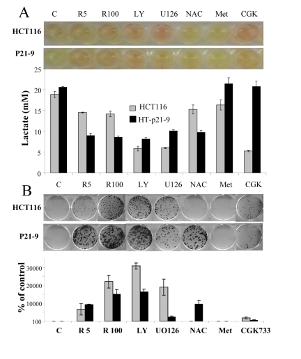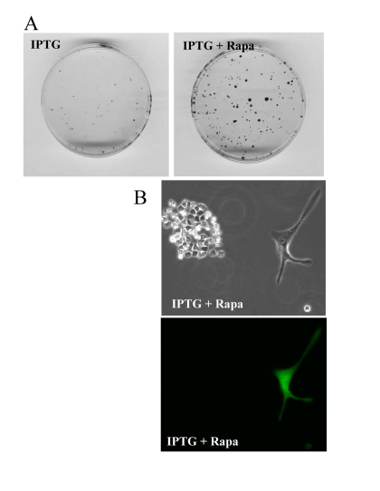 At initial density of 140000 cells, cells did not proliferate and did not die (Fig. 9). At this density, the level of lactate was maximal as well as the effect of rapamycin on CS (Fig. 8). Furthermore, we excluded the cytostatic effect of rapamycin by mixing IPTG- arrested HT-p21-9 (GFP-positive) cells with a few HCT116 cells, termed here as indicator cells. Since HT-p21-9 cells were already arrested by IPTG, rapamycin could not possibly arrest them further. The indicator HCT116 cells are not sensitive to cytostatic effects of rapamycin. Even if rapamycin could decrease proliferation of the indicator HCT116 cells, the small number of indicator cells could not significantly contribute to lactate production. We treated the cell mixture (80000 HT-p21-9 cells mixed with 2000 indicator cells) with IPTG (Fig. 10). After 4 days of incubation, small aliquots of cells were re-plated in fresh medium with IPTG to preclude proliferation of HT-p21-9 cells. As shown in Figure 10A, rapamycin dramatically increased a number of colonies. It was confirmed by microscopy that only HCT116 cells formed colonies, whereas IPTG-arrested HT-p21-9 (green) cells became senescent (large morphology of green cells) (Fig. 10B).