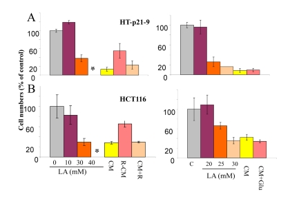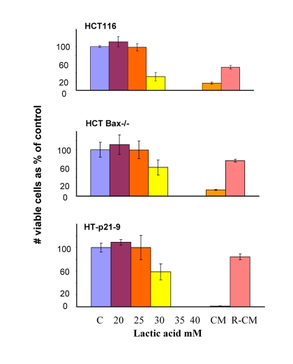 In comparison with HCT116 cells, HT-p21-9 cells produced considerably more LA during the first day, which reached sub-lethal levels at that time (Fig. 5A). This demonstrated that levels of LA reached on the first day determine CS. However, HCT-Bax−/− cells, which were less prone to CS produced more lactate than HCT116 parental cells, indicating that resistance to apoptosis can also determine the viability. That was confirmed by direct testing of lactate on cell viability: HCT-Bax−/− cells appeared to be slightly more resistant to 30 mM LA than parental cells (Fig. 7). Still, the difference in resistance was relatively small. The major factor that determined CS was the rate of LA production during the first day in culture (Fig. 5, 6). At low cell density, the difference in LA production was the most prominent (Fig. 6A). HT-p21-9 cells were the most glycolytic, whereas HCT116 cells were the least glycolytic (Fig. 6A, day 1). By day 4, HT-p21-9 cells produced near-lethal levels of lactate (Fig. 6A). Accordingly, HT-p21-9 cells lost viability by day 8 (Fig. 6 B, C).