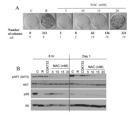Noteworthy, free radicals and oxidative stress can activate Akt/mTOR and vice versa active TOR may promote ROS [9, 56]. Therefore, inhibition of ROS by NAC is expected to decrease not only ROS levels but also mTOR activity. In fact, NAC inhibited CS in a dose-dependent manner with maximal effect at 20 mM (higher concentrations were toxic) (Fig. 4 A). In high cell density, mTOR was spontaneously deactivated after first day in culture. NAC inhibited the Akt/mTOR pathway by 6 hrs (Fig. 4B, 6 hrs), before mTOR becomes spontaneously deactivated. Noteworthy, the ATM inhibitor CGK733 also inhibited mTOR (Fig. 4B).