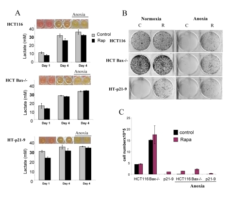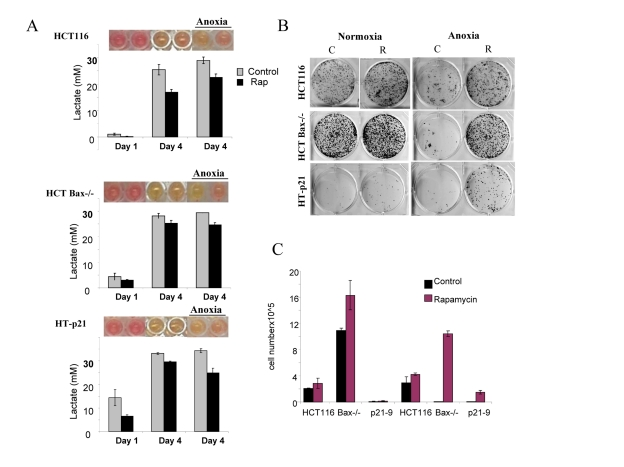 In anoxia experiments, cells were cultivated without oxygen for 3 days: from day 1 to day 4 (Fig. 5, 6). At high cell density on day 4, HT-p21-9 cells lost viability, which partially was prevented by rapamycin (Fig. 5 B, C). Furthermore, even HCT116 and HCT-Bax−/− cells lost viability in anoxia but not in normoxia (Fig. 5, 6). Yet, final levels of LA were almost identical in both normoxia and anoxia because CS prevented further accumulation of lactate (Fig. 5A, Fig 6A).