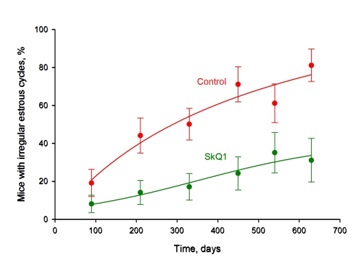 We now present results on females from the same colony of outbred SHR mice as in the preceding study [1, 2, 4] but living in a LP vivarium (Figure 1) (for comparison, data from the earlier experiments performed under non-LP conditions [3] are shown in the same figure). The median lifespan was doubled in the LP vivarium, independently of whether the mice were SkQ1 treated or not. This does not mean that SkQ1 was without any influence on the mice under LP conditions. For example, SkQ1 prevented the age-dependent disappearance of estrous cycles in females, a typical trait of aging of these animals (Figure 2).