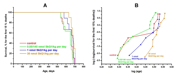Inbred male and female BALB/c mice were studied in the SPF vivarium in Moscow. SkQ1 did not influence the female median lifespan. However, a statistically significant effect was observed for the males. The median lifespan of untreated males was 690 days, i.e. shorter than that of females (770 days). SkQ1 increased the lifespan of the males to that of the females (Figure 4). More detailed analysis of the BALB/c strain females revealed a statistically reliable effect of SkQ1 upon survival curves in the region of in the first 15% of deaths (Figure 5A). This effect was especially clear when log (–log of survival) values were plotted against log of the age (Figure 5B). Moreover, SkQ1 was found to retard development of such trait of senescence as increase with age of heart mass [18]. In females, SkQ1 attenuated this effect of aging by almost 50% (Table 1). A similar effect of SkQ1 was observed in males (data not shown).