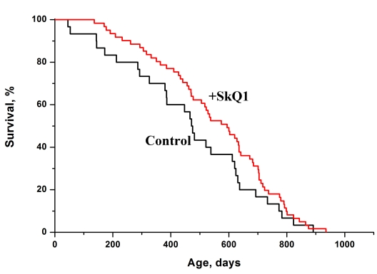 During the last seven years our group has studied the possibility of retarding aging with a mitochondria-targeted antioxidant composed of plastoquinone conjugated with a penetrating cation, decyltriphenyl-phosphonium, where the positive charge is strongly delocalized over three aromatic substituents of the phosphorous atom. SkQ1 [10-(6'-plastoquinonyl) decyltriphenylphosphonium] was synthesized [1, 2] and tested on fungi, crustaceans, insects, fish, and mice. It was found to increase the median lifespan of these organisms, and it retarded, arrested, and in some cases even reversed development of many age-related pathological traits [1-8]1. (For theoretical background on this project, i.e. the concept of programmed aging, see references [1, 9-11]).