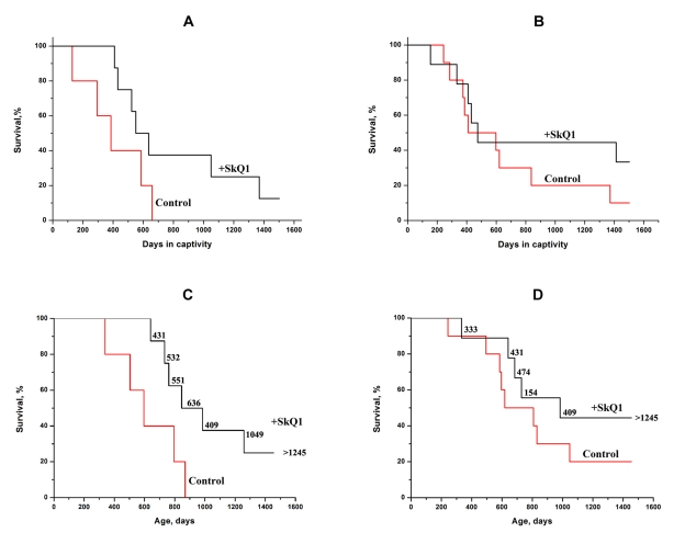Another species studied was the mole-vole Ellobius talpinus. The animals were captured in a taiga forest (Novosibirsk region), so their age could be estimated by means of post mortem methods only. Some of the SkQ1-treated animals were so long-lived that we had to present the data in two ways, namely by survival plotted against (i) the time spent in captivity (for all the animals studied, Figures 7A, B), and (ii) the age (for animals who died during the study, Figures 7 C, D). In the first case, the survival curves for SkQ1-treated mole-voles looked very unusual: they showed, in fact, two distinct phases. The first phase (until days 640 and 470 in captivity for males and females) when 50-60% of the animals had died, and the second phase when almost no deaths occurred in the SkQ1 groups (for males, only two animals died between days 640 and 1,500 in captivity; for females, one animal died between days 470 and 1,500). For the control (non-treated) mole-voles, the last male died on day 660 in captivity, whereas one of females survived at least to day 1,500.