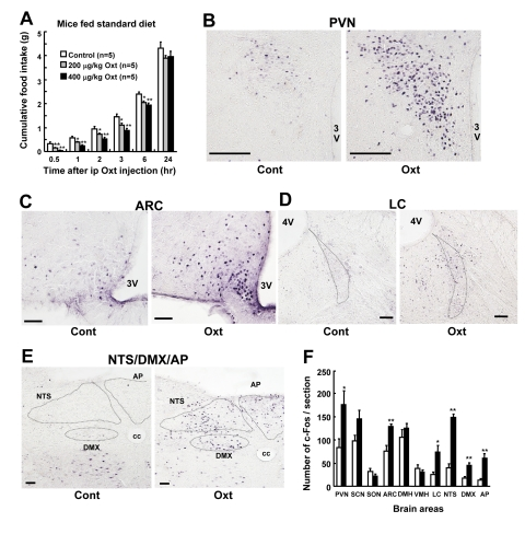 Ip injection of Oxt suppresses food intake and induces c-Fos expression in the hypothalamus and brain stem