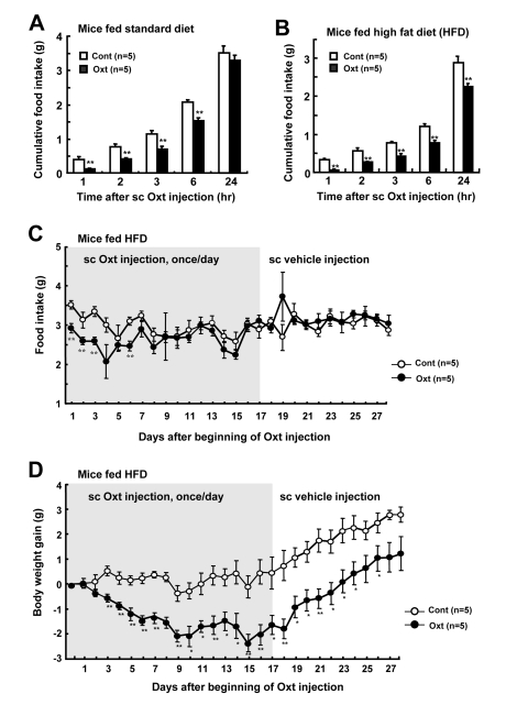 HFD-induced obese mice (43.9 ± 0.8 g BW) were sc injected once a day with 1,600 μg/5 ml/kg Oxt or vehicle for 17 days, followed by vehicle injection for 10 days in both test and control groups. Injection was executed at 2 hr before the dark phase, when BW and food intake were measured.