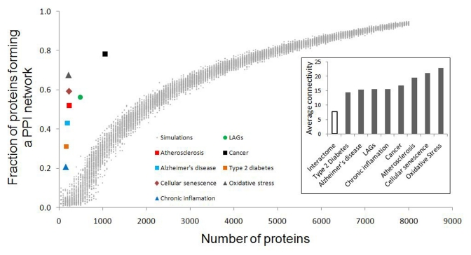 Apart from common genes, a great number of CS proteins directly interact with LAGs and ARD proteins through PPIs (Table 1). As such, the majority of CS genes fall either in the category of common genes or in that of genes directly connected to LAGs or ARD genes. In total, the genes in these two categories exceed 80% of the entire CS set. In addition, there are many common external protein partners, the number of which is more than one order of magnitude higher than that of common genes. As a result, almost all CS genes are linked to longevity and/or ARDs in one of the following ways - as common molecules, by forming protein complexes via PPIs, or through common partners.