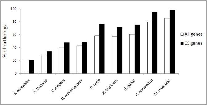 Evolutionary conservation of CS genes was analyzed using the InParanoid7 – Eukaryotic Ortholog Groups database ([34], http://inparanoid.sbc.su.se). To exclude inparalogs, we have used the default threshold score of 0.05. Essentiality of human genes was evaluated based on the data on mouse lethal phenotypes, which were retrieved from the Mouse Genome Informatics database ([89], www.informatics.jax.org). Functional and pathway analyses were performed with the tools provided by DAVID Bioinformatics Resources 6.7 ([90, 91], http://david.abcc.ncifcrf.gov) using data from the KEGG database ([92], http://www.genome.jp/kegg/pathway.html) and Gene Ontology ([93], http://www.geneontology.org). Protein-protein interacttion (PPI) data from the BioGRID database ([27], http://thebiogrid.org), human interactome release 3.1.71, was used for the analysis of connectivity and interconnectivity. The largest fraction of proteins which forms a continuous network was used as a measure of interconnectivity. To generate control data, simulations with sets of randomly selected proteins from the interactome were performed. The size of protein sets ranged from 50 to 8000 genes, with a step of 50. In each case, one hundred simulations were run and the relation between the size of the set and the fraction of genes interconnected by chance was quantified. The simulations and the creation of the microRNA-regulated PPI CS network were done using YABNA (Yet Another Biological Networks Analyzer). The YABNA software program and the algorithm for the construction of miRNA-regulated PPI networks have been previously described in detail ([24, 25], http://www.netage-project.org). The graphical output of the CS miRNA-regulated PPI network was generated using Cytoscape 2.8.0 ([94], http://www.cytoscape.org/).