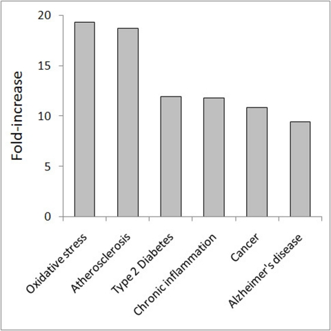The analysis revealed that 19% of the CS genes are also orthologous to LAGs from model organisms, and 53% of the CS genes are involved in at least one ARD (Table 1). The highest overlap was observed for cancer (53%); lesser values were observed for atherosclerosis (20%), Alzheimer's disease (9%) and type 2 diabetes (9%). The overlap of CS genes with oxidative stress and chronic inflammation associated genes reached 21% and 8%, respectively. In all the above cases, the overlap was significantly greater than expected by chance (p < E-25). Notably, among overlapping genes there are many which are essential for growth and development (from 38% to 55%, depending on the gene set). This high percentage of essential genes is comparable to that found in the Common Gene Signature of longevity and major ARD networks [25].