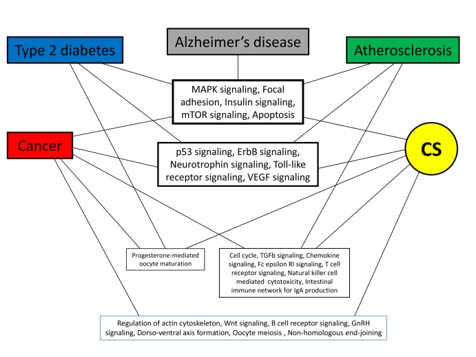 Given the over-representation of growth-promoting and cell-cell/ECM contact pathways in CS, it was expected to see cancer-associated pathways in the enrichment list, since cell proliferation and growth promotion are intrinsic properties of the cancer cells. Indeed, the most over-represented category in CS is “Pathways in cancer” followed by the pathways for specific forms of cancer, including “Bladder cancer”, “Prostate cancer”, “Colorectal cancer”, “Chronic myeloid leukemia”, “Glioma”, “Melanoma”, and others and tumor suppressor “p53 signaling” (Suppl. Table 3). It should however be kept in mind that the final outcome (CS or cancer) of activation or inhibition of these pathways depends on many additional factors, discussed in details elsewhere [21].