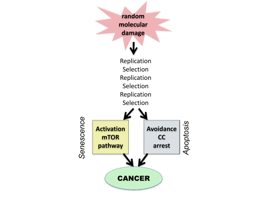 However, molecular damage is not sufficient either to cause cancer or to hurt organism. This damage is multiplied billions of times via cell replication. Also, cells with random mutations undergo non-random selection (Figure 1).