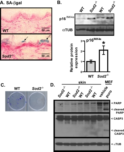 Consistent with increased cellular senescence in Sod2−/− mouse skin, keratinocytes isolated from dorsal skin of these mice failed to form colonies in culture, in sharp contrast to keratinocytes isolated from WT mice (Figure 4C). Because apoptosis can also prevent the clonal expansion of cells, we measured the extent of poly-ADP-ribose polymerase (PARP) and caspase-3 (CASP3) cleavage, markers of apoptosis. WT and Sod2−/− skin had similar levels of full length PARP and CASP-3, with little or no evidence of cleavage (Figure 4D). As a positive control, we treated WT MEFs with the pro-apoptotic drug puromycin. This showed increased PARP and CASP3 cleavage in these but not untreated MEFs (Figure 4D). These results suggest that Sod2 deficiency in mouse skin promotes cellular senescence but not apoptosis.