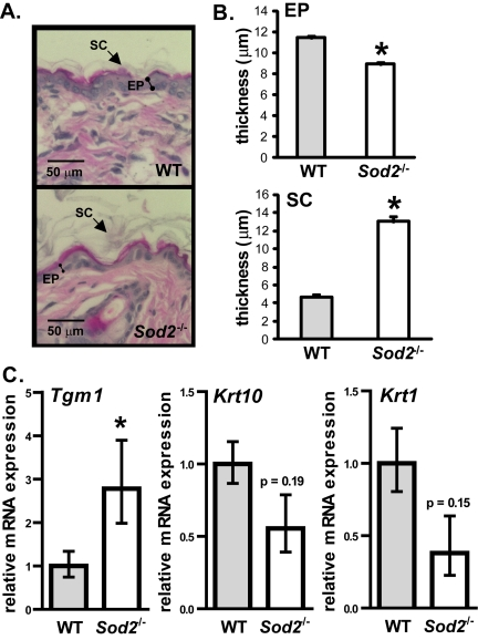 To determine the effect of Sod2 deficiency on skin phenotype, we analyzed the histology of WT and Sod2−/− skin. Sod2−/− mice had a thinner epidermis (containing nucleated cells) relative to WT mice (Figure 5A and B). This thinning appeared to be due to fewer cells in the epidermis (Figure 5A), consistent with less proliferation due to senescence. Interestingly, Sod2−/− skin also had a thicker stratum corneum (Figure 5A and B). This layer is composed of terminally differentiated anucleated cells that originate from the basal layer of the epidermis [50].