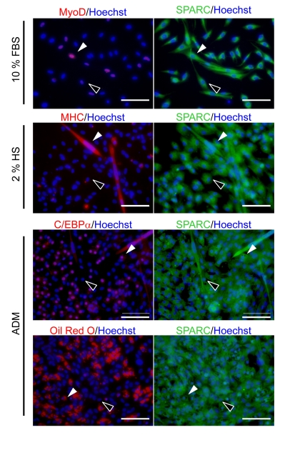 Primary antibodies and their species of origin were as follows: anti-SPARC (goat, R&D systems, Minneapolis, MN, USA, 1:100 dilution); anti-MyoD (mouse, clone A5.8, Novocastra, Newcastle upon Tyne, UK, 1:100 dilution), anti-C/EBPα (rabbit, Santa Cruz Biotechnology, Santa Cruz, CA, USA, 1:200 dilution), anti-myogenin (mouse, clone F5D, hybridoma supernatant, Developmental Studies Hybridoma Bank, Iowa City, IA, USA, 1:200 dilution), anti-MHC (mouse, clone MF20, hybridoma supernatant, Developmental Studies Hybridoma Bank,1:200 dilution), and anti-ITGA5 (rabbit, AB1928, Millipore, Bedford, MA, USA, 1:1000 dilution).