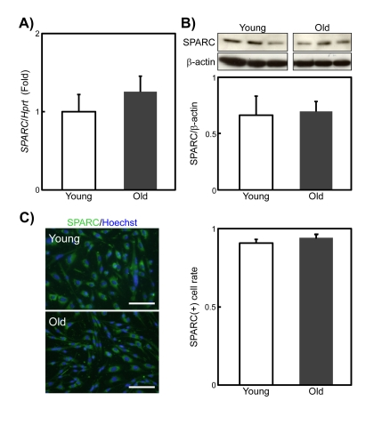The adipogenic potential of SMPC increases with age [8], which we confirmed here (data not shown). Because SPARC inhibits adipogenesis [15], the age-related increases in the adipogenic potential of SMPCs may be due to a decline in their secretion of SPARC. However, quantitative PCR analysis revealed no differences in SPARC expression levels between SMPCs from young and old rats (Figure 2A). Immunoblotting and immunostaining of SPARC in young and old SMPCs also showed that the levels of SPARC expression in SMPCs does not change with age (Figures 2B and 2C). These results suggest that the increased adipogenic potential of old SMPCs is not caused by a decline in SPARC.