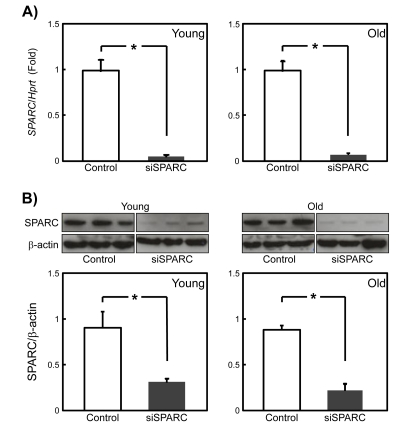 Despite the anti-adipogenic function of SPARC [15], there was no difference in the expression of SPARC as a function of SMPC age. This raises the possibility that responsiveness of SMPCs to SPARC, rather than its expression, declines with age. To examine this, we employed the siRNA for SPARC (siSPARC) in an attempt to down-regulate SPARC. First, we determined the knockdown efficiency of siSPARC in young and old SMPCS by qPCR and immunoblotting. One day after siSPARC transfection, SPARC gene expression was silenced by more than 90% in young and old SMPCs (Figure 3A). Immunoblotting revealed that the amount of SPARC was reduced to a similar extent in cells derived from young and old rats (Figure 3B). These results indicate that the efficiency of siRNA-mediated knockdown of SPARC did not change in SMPCs with age.