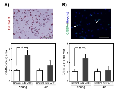 We next evaluated the adipogenic potential of young and old SMPCs when SPARC expression was reduced by its cognate siRNA (Figure 4). In young SMPCs transfected with siSPARC, the Oil Red-O-positive area was increased, suggesting that SPARC suppresses adipogenesis (Figure 4A). In contrast, no changes were observed in old SMPCs. Adipogenesis was also evaluated by immunostaining for C/EBPα, a transcription factor whose levels increase with adipogenesis. The results were similar to those for Oil Red-O staining (Figure 4B), suggesting that endogenously produced SPARC inhibits adipogenesis of SMPC, but this effect diminishes with age, presumably due to the loss of SPARC function.