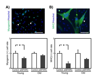 SPARC activates myotube formation [16, 17]. Thus, we examined whether decreased SPARC expression altered myogenesis in SMPCs. Young and old SMPCs were transfected with siSPARC, and myogenesis was evaluated by immunostaining for myogenin and MHC, which serve as markers for terminal myogenic differentiation. In young SMPCs, silencing of endogenous SPARC expression reduced the proportion of myogenin-positive cells (Figure 5A) and nuclei in MHC-positive cells (Figure 5B). In contrast, no statistically significant effects were observed in old SMPCs. These results suggest that SMPCs activate their myogenesis but that this stimulatory effect is lost with age.