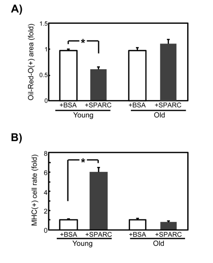 We investigated whether exogenous addition of SPARC to SMPCs inhibits adipogenesis and promotes myo-genesis when endogenous SPARC is downregulated by siRNA. As shown in Figure 6, addition of 20 μg/ml SPARC decreased adipogenesis by approximately 60% (Figure 6A) and increased myogenesis by 6-fold (Figure 6B) in young SMPCs, whereas this did not affect old SMPC cultures. These results suggest that old SMPCs are less sensitive to exogenous SPARC, and further support the notion that responsiveness of SMPC to SPARC declines with age.
