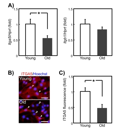 Heterodimers composed of integrin α5 (ITGA5) and integrin β1 (ITGB1) serve as the receptor for SPARC on adipose stromal cells [22]. We therefore tested the possibility that the age-related decline in SPARC responsiveness is caused by a loss of ITGA5 and/or ITGB1. Quantitative PCR analysis revealed an approximately 50% decrease in the Itga5 expression level in old compared with young SMPCs, but not Itgb1 expression level (Figure 7A). We next determined whether decreased ITGA5 expression contributed to the age-related decline of SPARC responsiveness. Most young SMPCs were stained strongly by an ITGA5 antibody, whereas only approximately 20% of the old SMPCs were stained at an intensity similar to that of young SMPCs. The remaining cells were faintly stained (Figure 7B). We then quantified ITGA5 expression levels in young and old SMPCs by immunofluorescence. As shown in Figure 7C, fluorescence decreased by approximately 50% in old compared with young SMPCs, which is consistent with the results of qPCR.